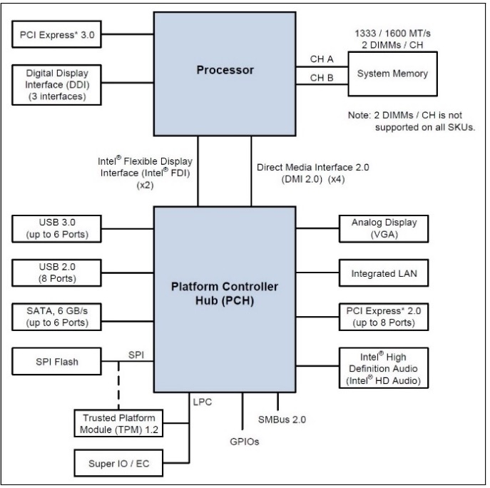 Wie im Diagramm zu sehen, sitzen einige Komponenten (RAM, PCI-e Lanes) aus Gründen der Geschwindigkeit direkt an der CPU. Die restliche Peripherie wird an dem PCH-Chip oder weiteren Controllern angeschlossen.