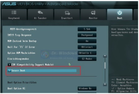 Eine weitere neue Schutzfunktion in Computern ist die BIOS / UEFI-Funktion "Secure Boot". Diese Funktion soll das Laden von Schadsoftware beim Starten des Computers verhindern. Damit dieses Schutzprinzip funktioniert werden im BIOS / UEFI sogenannte "Security Keys" hinterlegt, das heisst das Gerät kann nur von verifizierten Geräten booten.